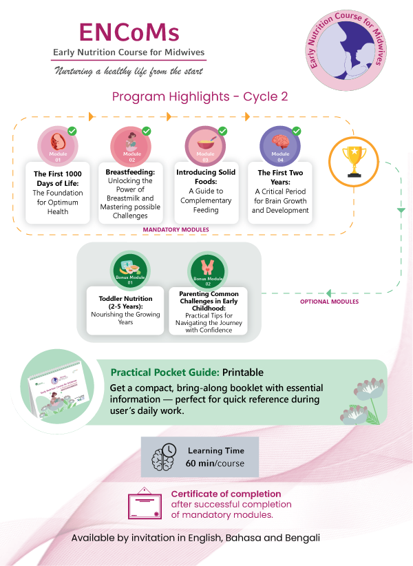 ENCoMs offers evidence-based eLearning modules on early child nutrition tailored for midwives, equipping them with the knowledge and tools essential to support a healthy start for every child. By covering topics such as nutrition during pregnancy, breastfeeding, and complementary feeding, this program empowers midwives to provide the best support during the most formative stages of life, based on latest clinical guidelines and advanced techniques.