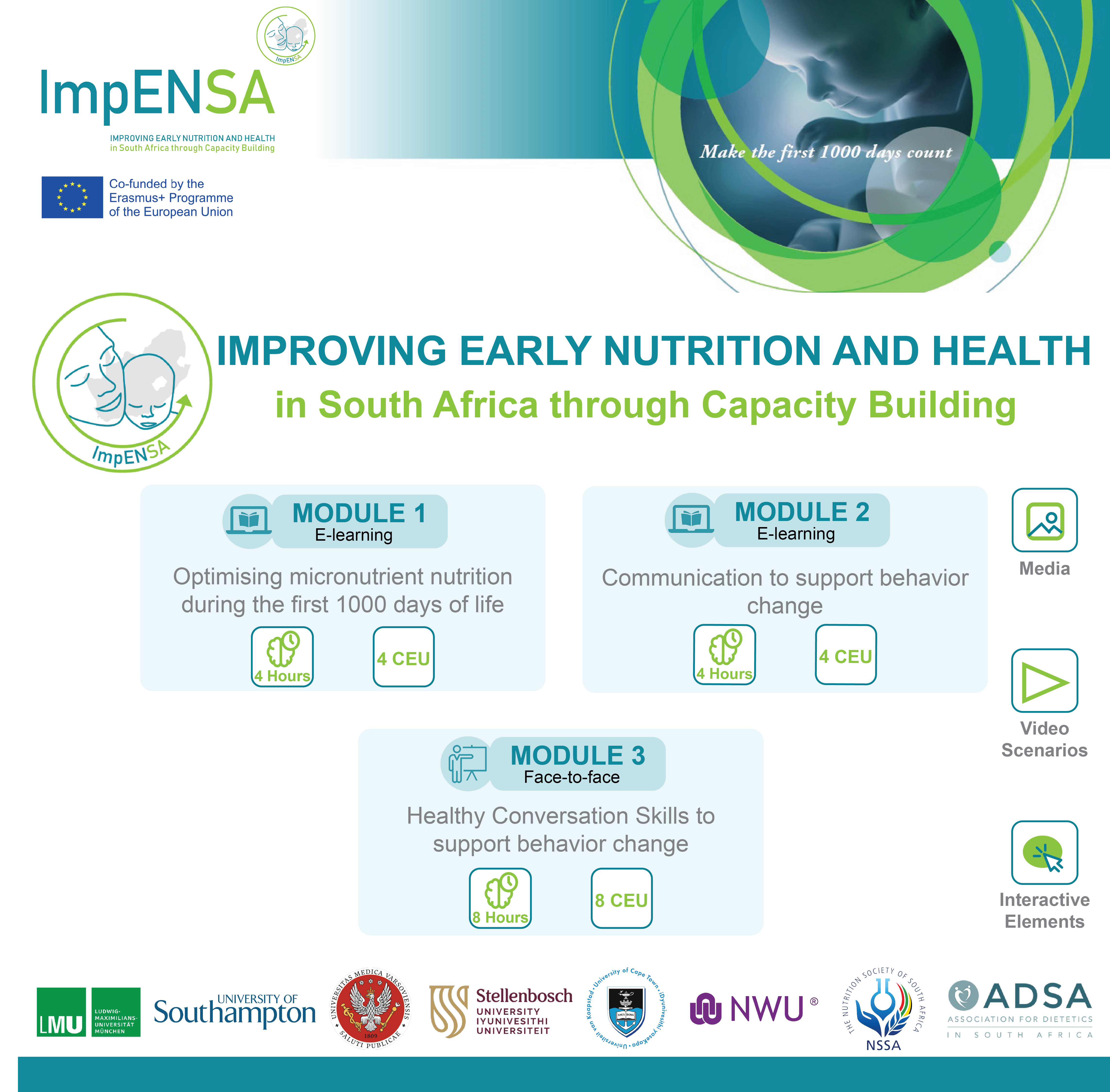 The ImpENSA project is a multi-center collaboration co-funded by the European Union's Erasmus+ Programme (2016-2020). The project brought together eight organizations from South Africa and Europe to that has developed the ImpENSA blended Training Programme. This Programme aims to equip healthcare professionals in South Africa with knowledge and skills to improve micronutrient nutrition and behavior change in the first 1000 days of life. Two preparatory modules are available on the ImpENSA e-learning platform, after completion of which participants can enroll in the subsequent face-to-face training on "Healthy Conversation Skills".