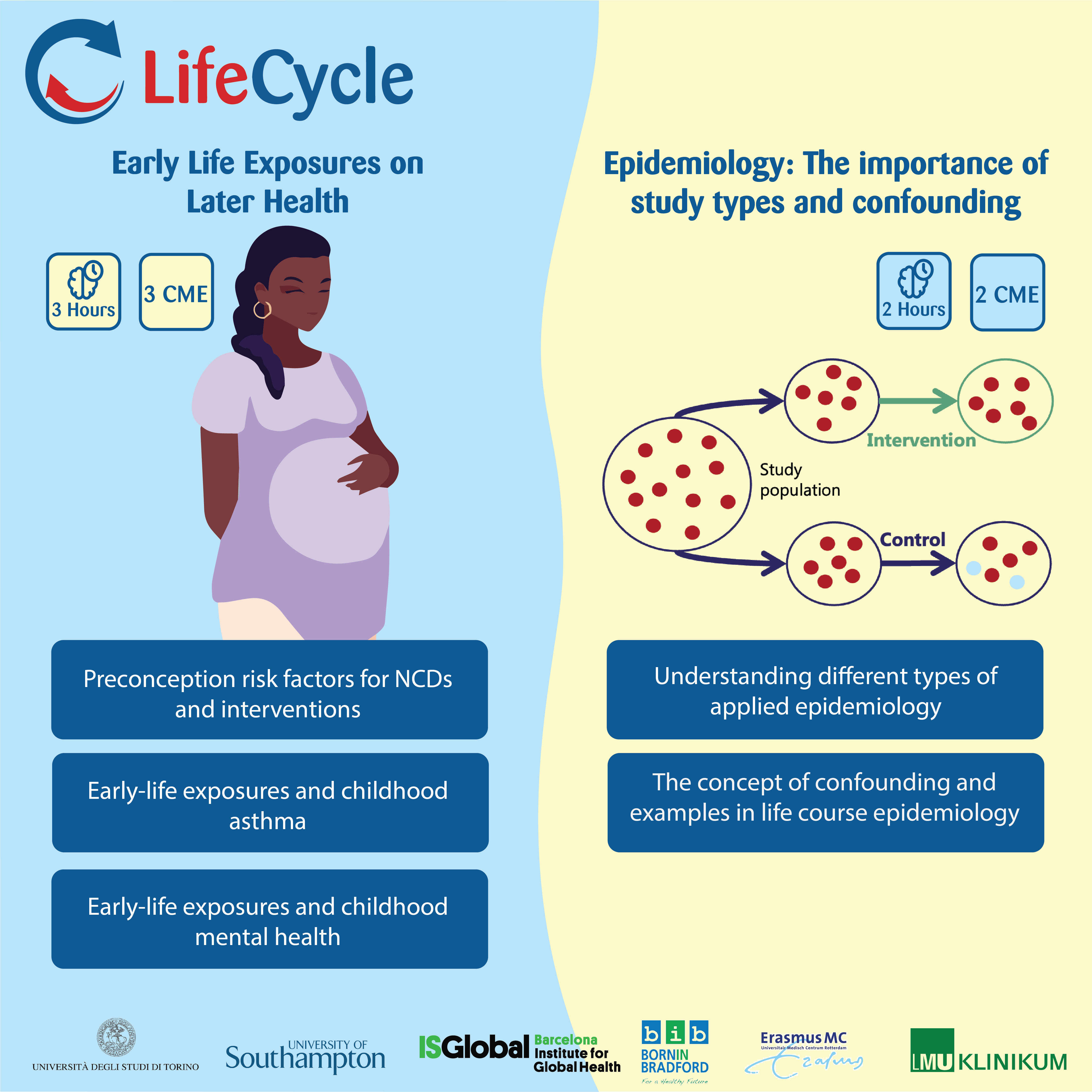 The LifeCycle Project brings together European research studies focused on early life exposures and health outcomes on later health. Research topics and outputs of the LifeCycle project have been translated into practical application for healthcare professionals and good practice recommendations for researchers in the form of two open access Focus Modules on ENeA Global e-learning platform. Learners can earn up to 5 CME points from these two modules.
