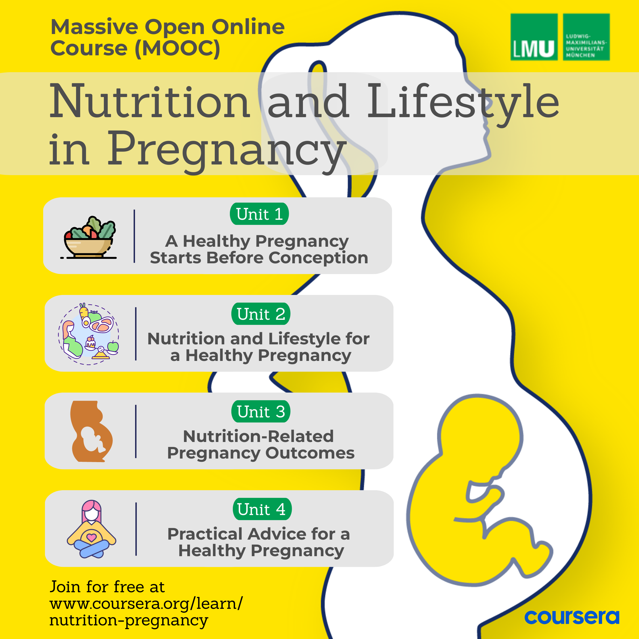Our open-access Massive Open Online Course (MOOC) “Nutrition & Lifestyle in Pregnancy” hosted on the Coursera platform touches comprehensively on how nutritional and lifestyle aspects, both during pre-conception and during pregnancy, can impact the health of expecting mothers and their offspring. Following the latest scientific evidence and international recommendations, we explain how maternal physiological and metabolic adaptations during pregnancy influence nutrient requirements, we cover the most common nutrition-related pregnancy complications; and lastly, provide recommendations to ensure optimal maternal and fetal outcomes. This course aims to aid healthcare professionals to improve their counselling in their day-to-day interactions with pregnant women and those wishing to become pregnant. Nevertheless, anybody interested in the topic is welcome to join this course and benefit by gaining knowledge on this topic.